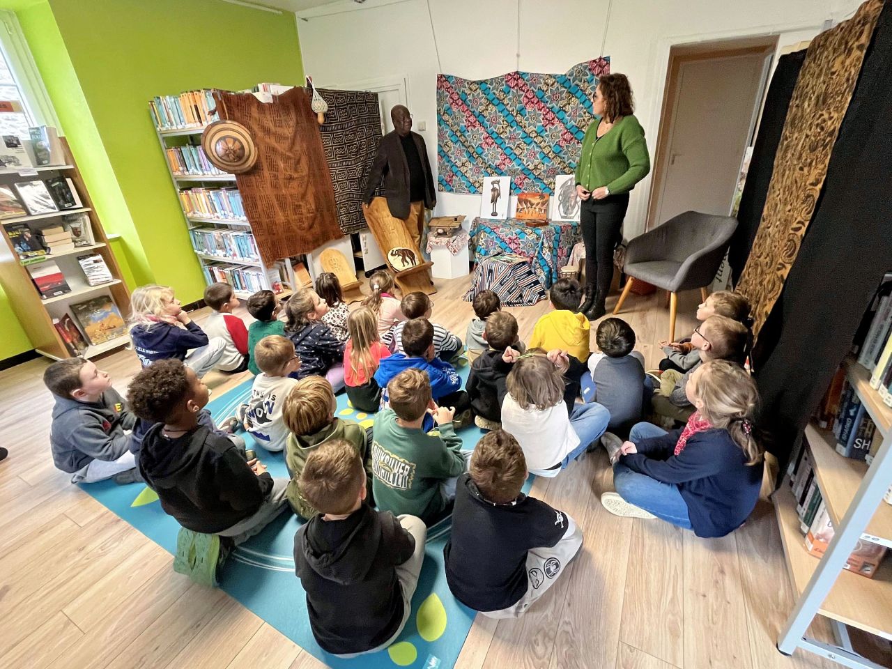 Les 2 classes de cycle 2 sont allées à la bibliothèque pour rencontrer Mr Koné. Il nous a parlé le l’Afrique de l’Ouest. Et Marie-Pierre nous a raconté 2 contes : Niam Kala et Djabounde .